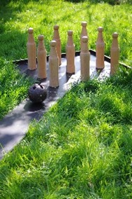 Probeer de negen kegels om te gooien met de bol op de kegelbaan.
